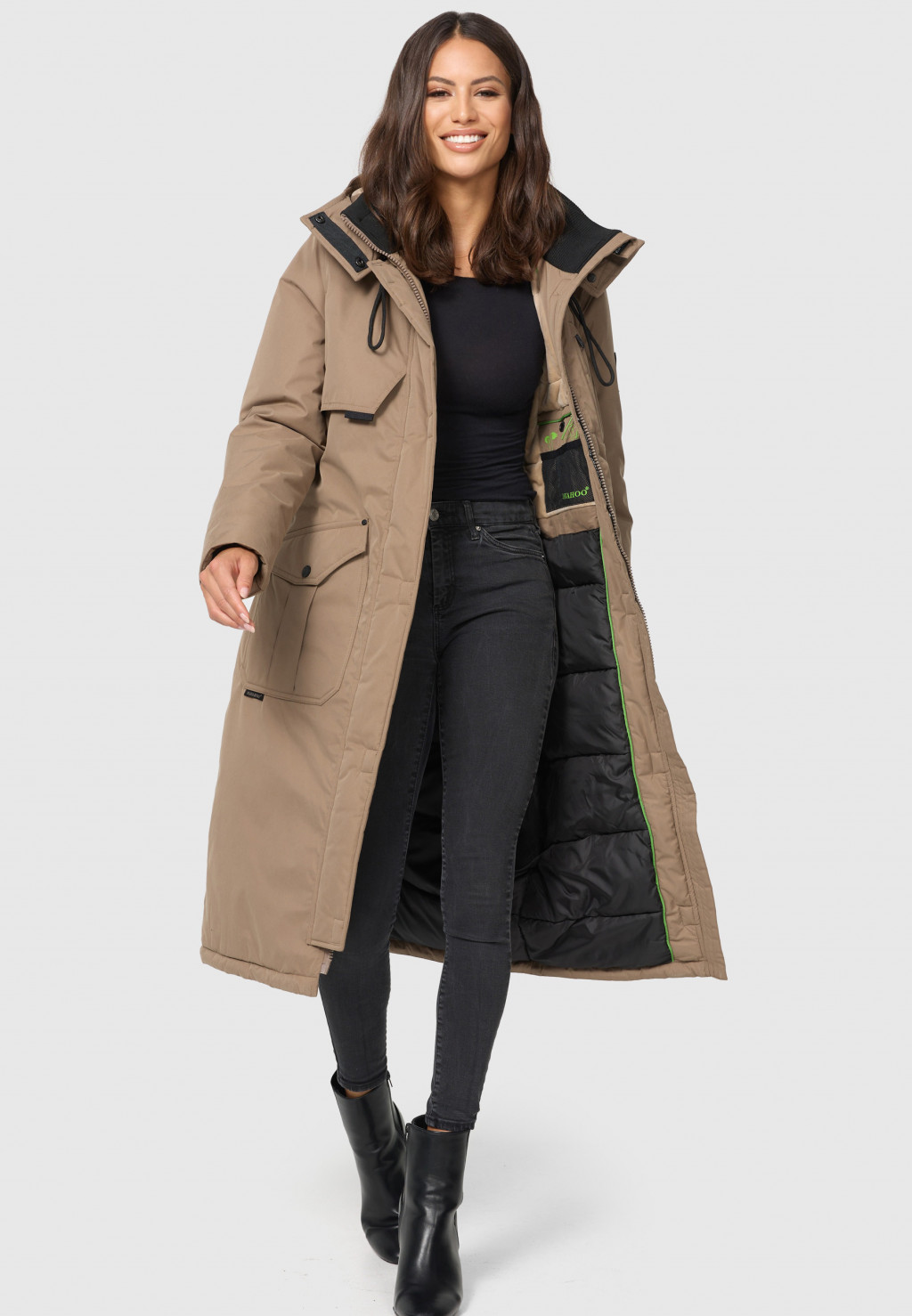 - Κουκούλα αποσπώμενη με επένδυση γούνας και κορδόνι περίσφιξης